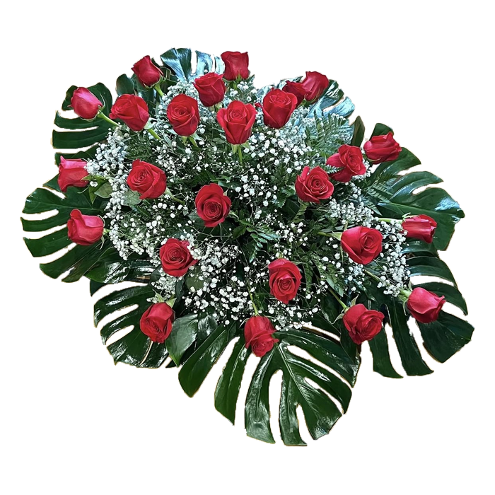 Centro con 24 Rosas BLANCAS y verdes decorativos junto con otras flores blancas para armonizar el arreglo floral funerario. En la diagonal más larga ponemos la cinta con el mensaje que quiere que vean los familiares, para dar nuestro apoyo y sentimiento.