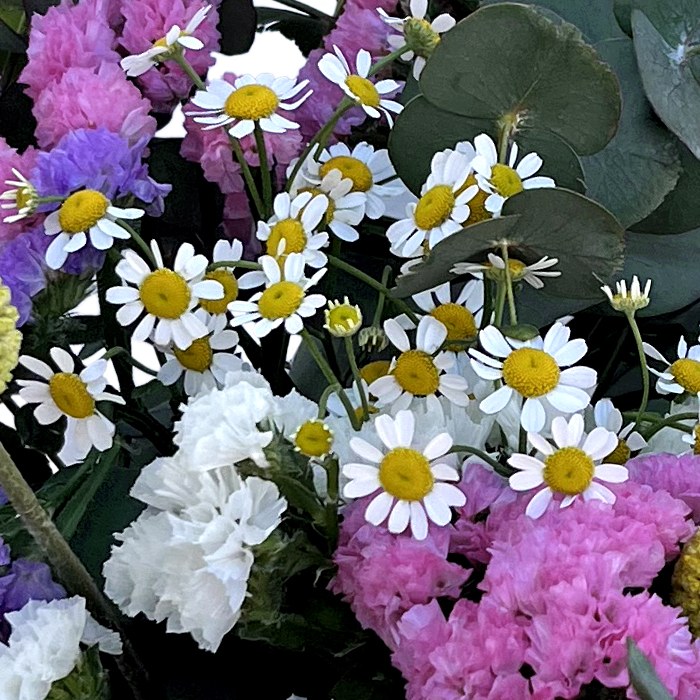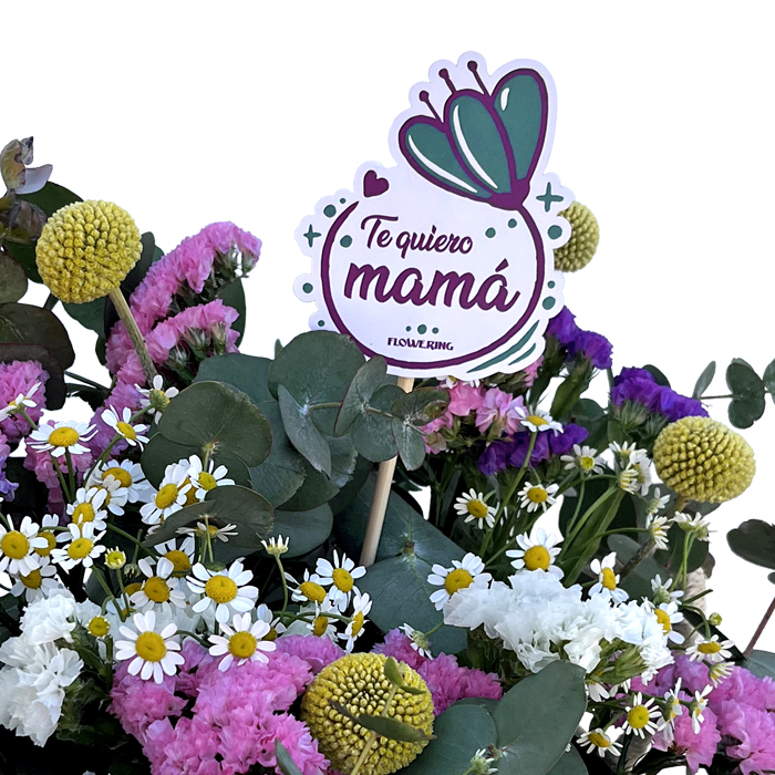 Bonita composición de flores silvestres compuestas por statice multicolor, eucalipto y craspedia, realizado en un bonito cesto de mimbre, perfecto para regalar el Día de la Madre. Incluye pick Te Quiero Mamá.
