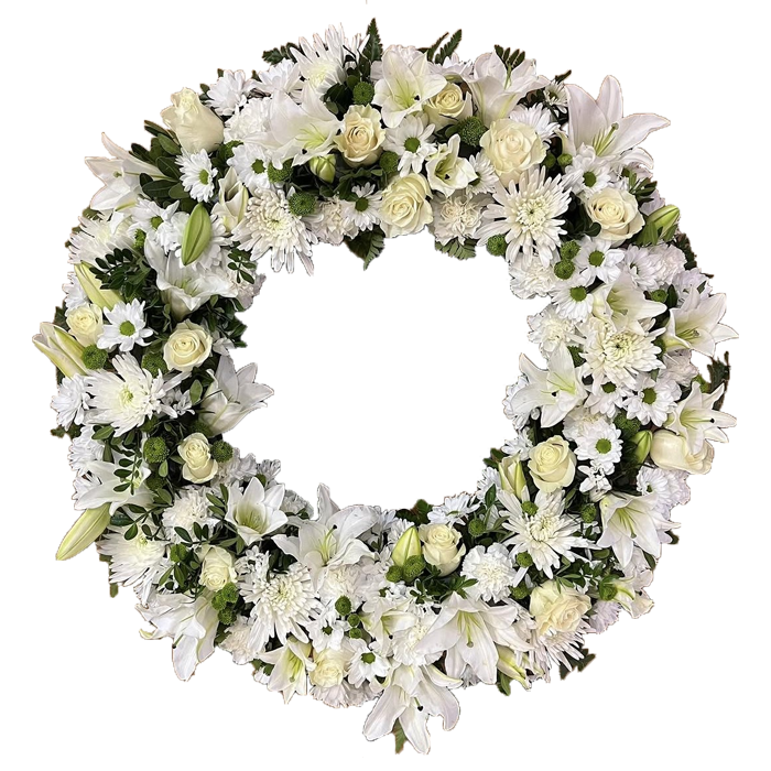 Centro con 24 Rosas BLANCAS y verdes decorativos junto con otras flores blancas para armonizar el arreglo floral funerario. En la diagonal más larga ponemos la cinta con el mensaje que quiere que vean los familiares, para dar nuestro apoyo y sentimiento.