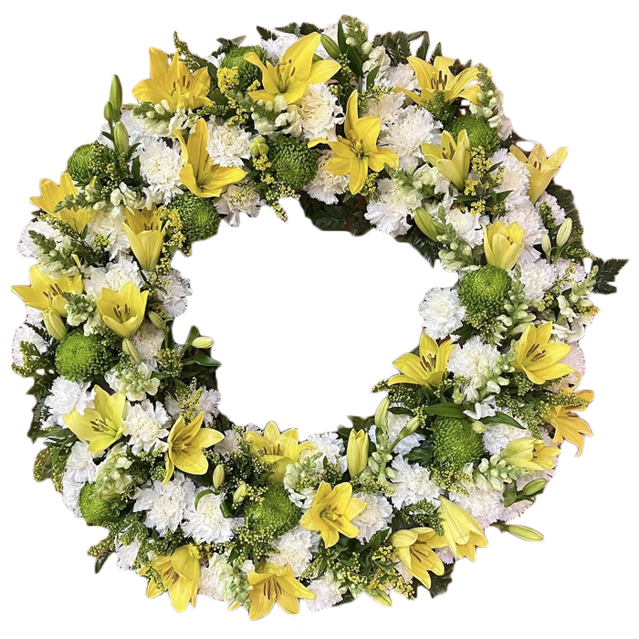 Centro con 24 Rosas BLANCAS y verdes decorativos junto con otras flores blancas para armonizar el arreglo floral funerario. En la diagonal más larga ponemos la cinta con el mensaje que quiere que vean los familiares, para dar nuestro apoyo y sentimiento.