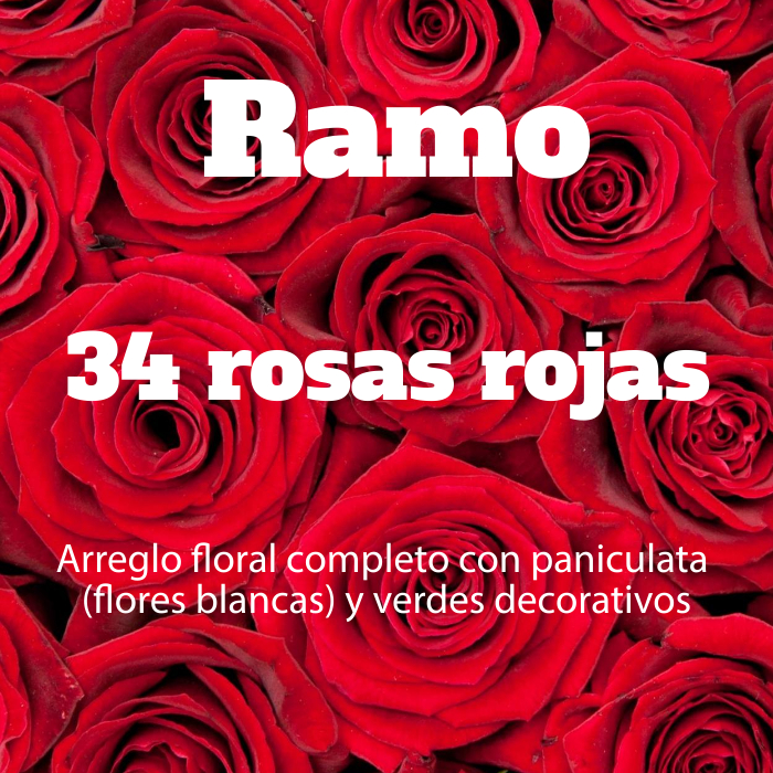 Arreglo especial regalo con 34 rosas rojas, paniculata y verdes decorativos.