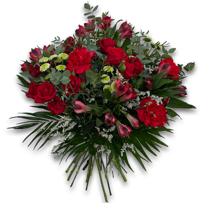 Ramo de flores variadas en tonalidades rojas en las que se incluye 3 tallos de rosas rojas de pitiminí (multiflora)